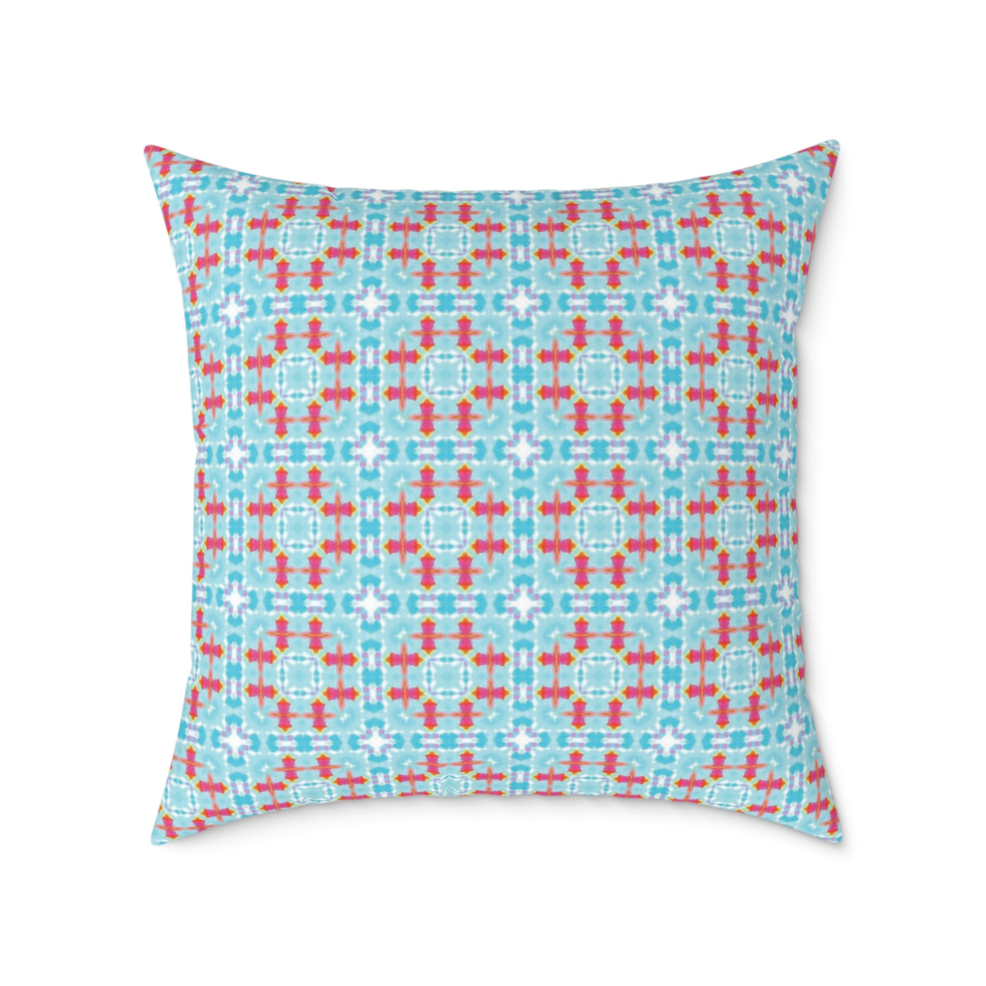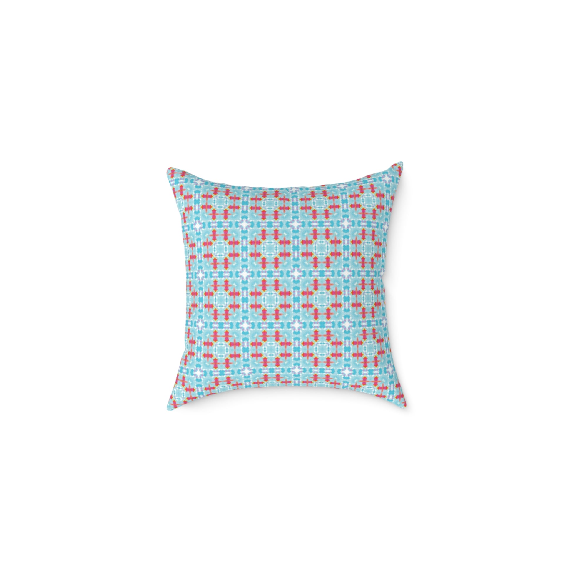 A bright, patterned square cushion that brings a playful, modern touch to cosy corners. The lightweight polyester canvas has a fine weave and soft hand, while the resilient polyester filling keeps the shape plush and supportive for floor lounging or accent seating. The grid-like turquoise and coral motif reads fresh and geometric — it livens a reading nook, complements mid-century modern accents, or adds spirited colour to a sunroom. Double-sided printing ensures the design reads consistently from every angle, and a concealed zipper keeps lines clean while allowing easy cover removal for spot care. Available in multiple sizes so you can mix and match scales across a sofa or create a welcoming floor stack for relaxed gatherings.