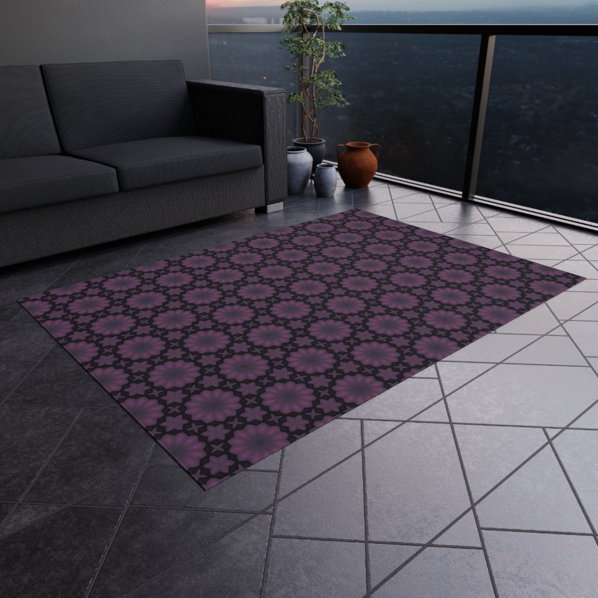 Purple Floral Geometric Outdoor Rug — Weatherproof Patio Mat